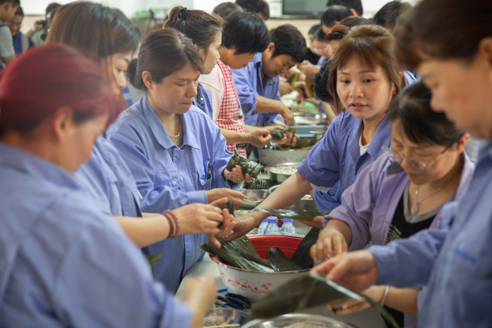 包粽子現場,職工們分工默契,熟練地捋粽葉、做漏斗狀、填糯米、壓緊實、封口、扎捆,一個個有模有樣的粽子迅速成型,現場被歡樂和諧的節日氣氛包圍,其樂融融。